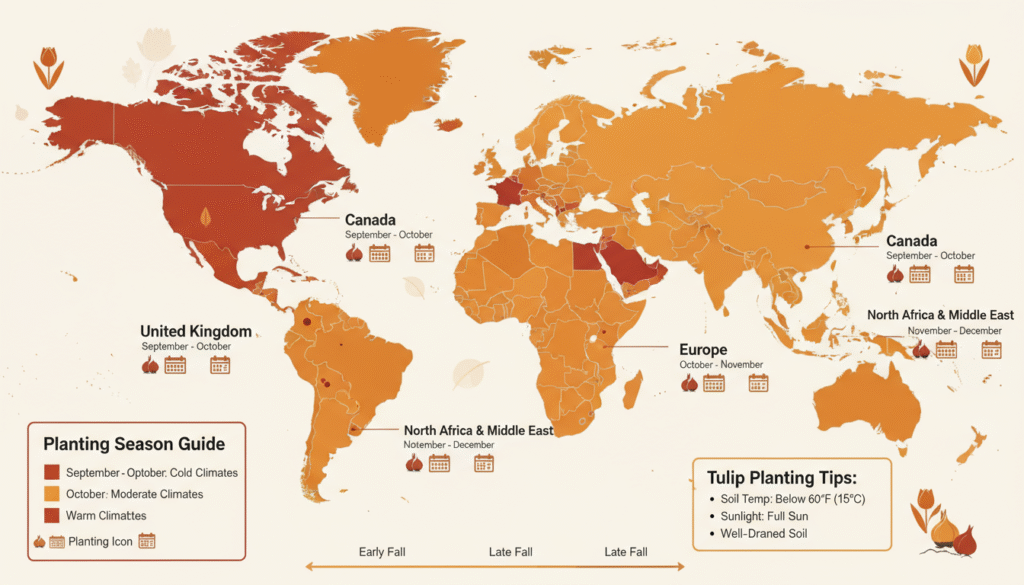 Tulip bulbs should be planted when the soil is below 60°F (15°C) but above freezing. That’s when roots can grow steadily without the risk of premature sprouting.