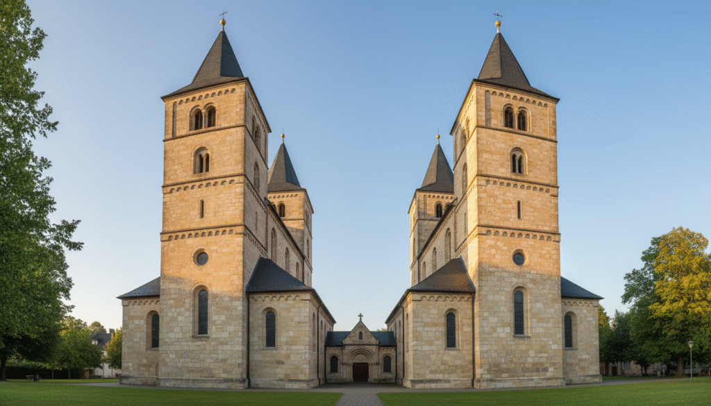 Located in modern-day North Rhine-Westphalia, this church has its own quiet power. It was built under Abbess Mathilde, who belonged to the royal Ottonian family. The church combines Roman inspiration with German engineering, featuring sturdy towers and an octagonal westwork that later inspired many Romanesque buildings.